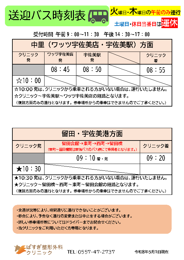 令和8年5月1日より送迎バス(中里・留田・宇佐美港方面)の時刻表が次のとおりとなります。